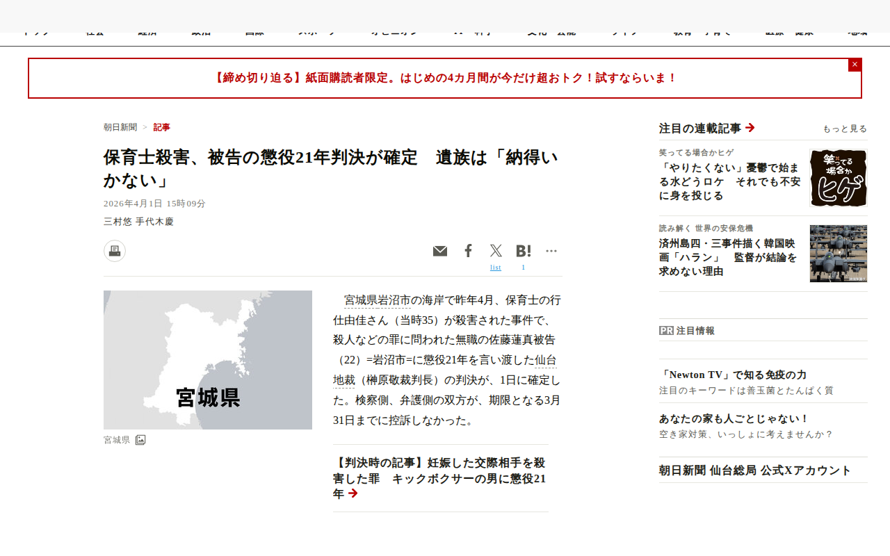 このページは、宮城県岩沼市の海岸で昨年4月に保育士の行仕由佳さん(当時35)が殺害された事件について報じている。殺人などの罪に問われた無職の佐藤蓮真被告(22)に対し、仙台地裁が言い渡した懲役21年の判決が確定したことを...