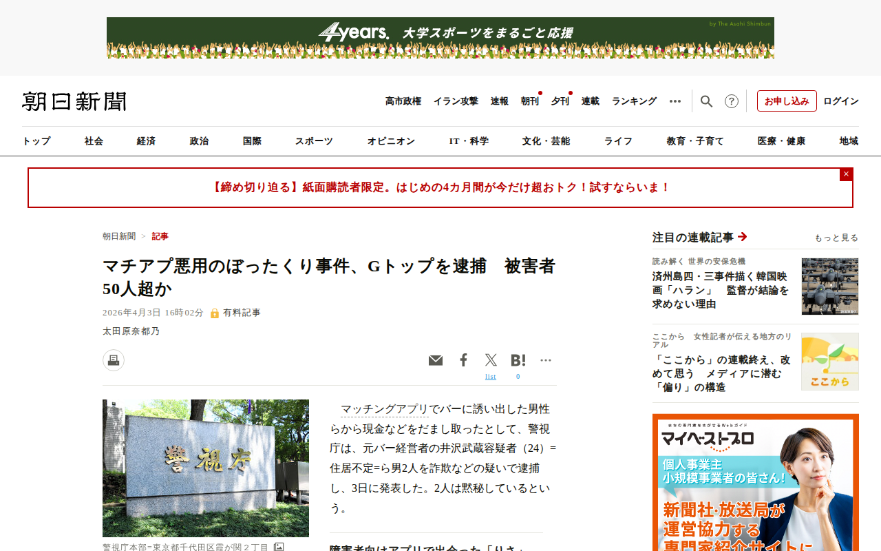 マチアプ悪用のぼったくり事件、Gトップを逮捕 被害者50人超か [東京都]:朝日新聞