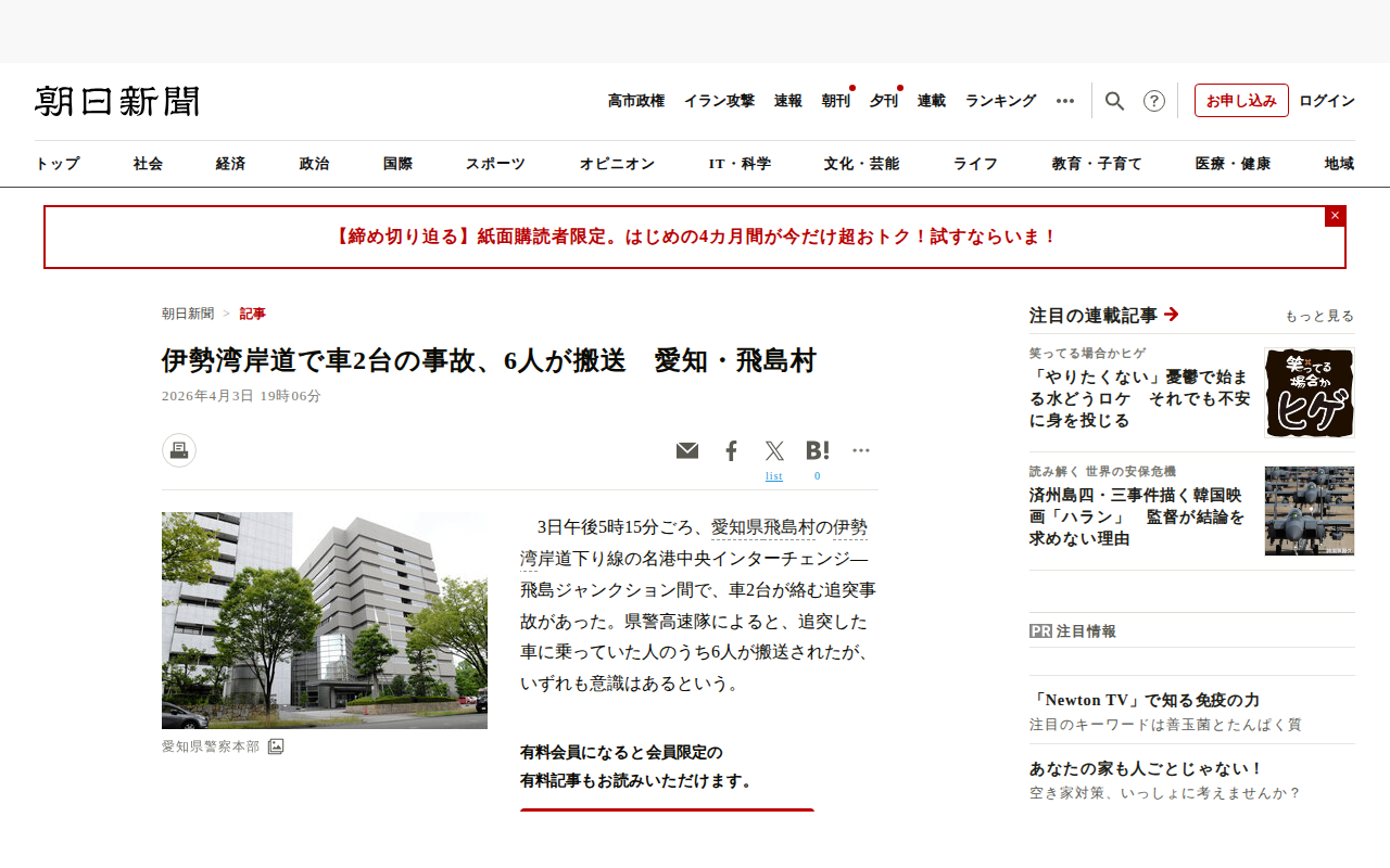 このページは、2026年4月3日午後5時15分ごろ、愛知県飛島村の伊勢湾岸道下り線で発生した車2台の追突事故を報じている。名港中央インターチェンジと飛島ジャンクション間での事故で、追突した車に乗っていた6人が搬送されたが...