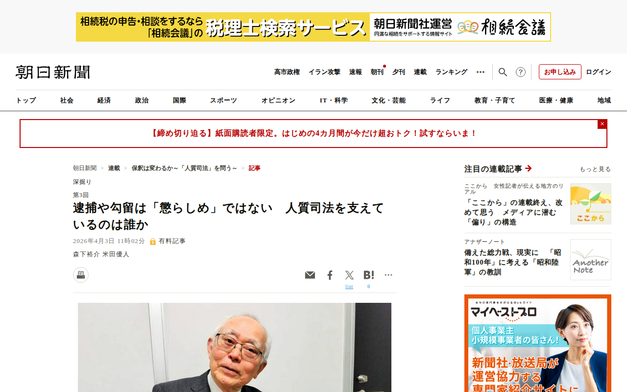 このページは、日本の刑事司法における「人質司法」問題を扱った朝日新聞の連載記事である。元裁判官で現在弁護士の石塚章夫氏が、逮捕・勾留による身体拘束が容疑者に虚偽自白を強いる構造を指摘している。刑事訴訟法では任意捜査が原則...