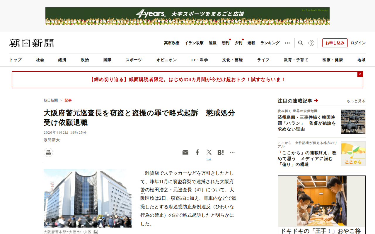 大阪府警元巡査長を窃盗と盗撮の罪で略式起訴 懲戒処分受け依願退職 [大阪府]:朝日新聞