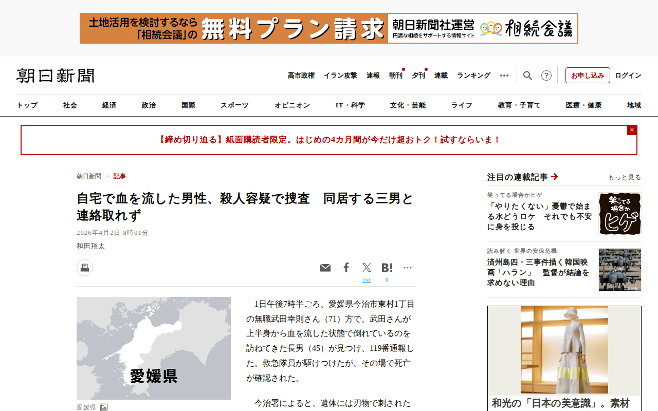 このページは、愛媛県今治市で2026年4月1日午後に発生した殺人事件について報じている。無職の71歳男性が自宅で上半身から血を流した状態で倒れているのを訪ねてきた長男が発見し、通報した。遺体には刃物で刺されたとみられる傷...