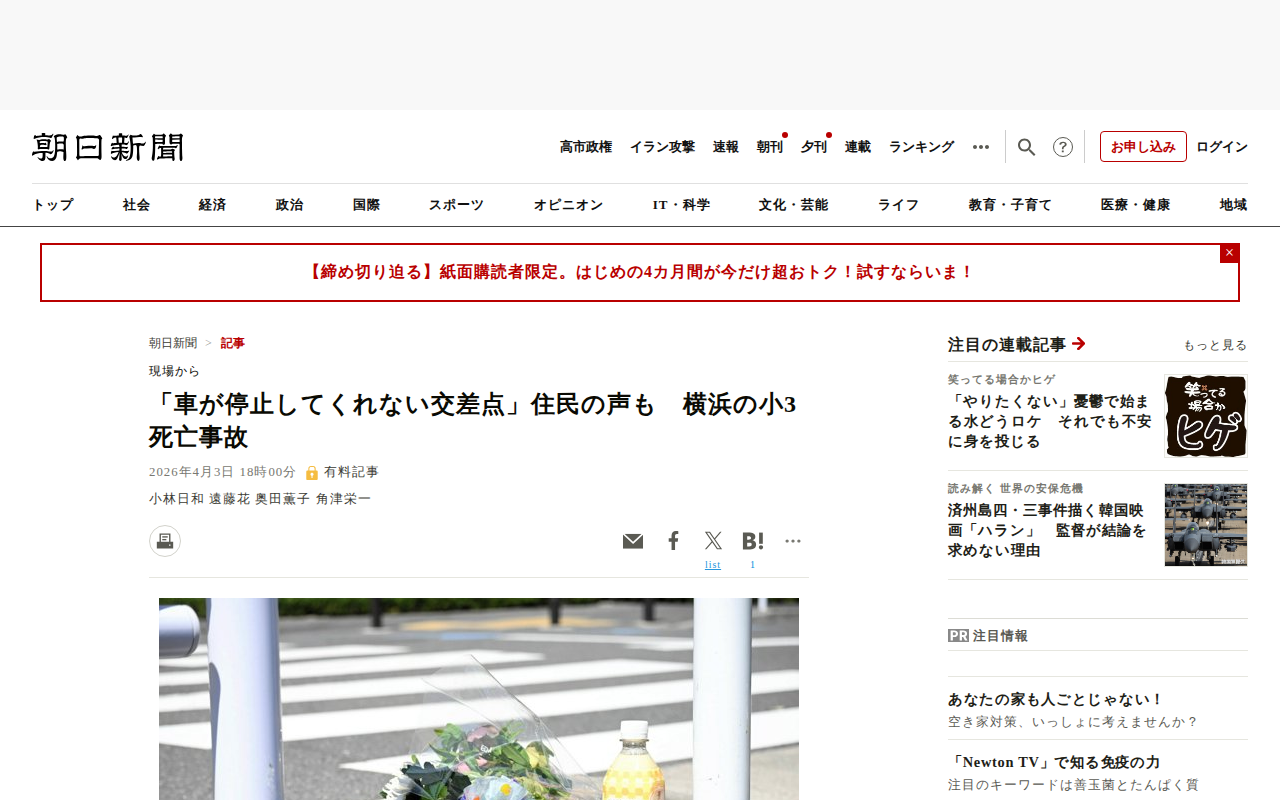 「車が停止してくれない交差点」住民の声も 横浜の小3死亡事故 [神奈川県]:朝日新聞