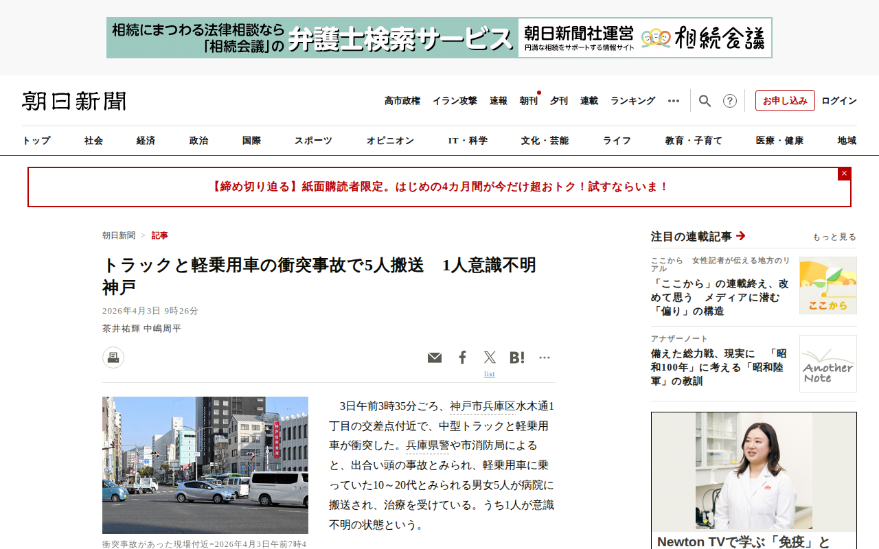 このページは、2026年4月3日午前3時35分ごろに神戸市兵庫区で発生した中型トラックと軽乗用車の衝突事故についてのニュースです。軽乗用車に乗っていた10~20代の男女5人が病院に搬送され、うち1人が意識不明の状態にあり...