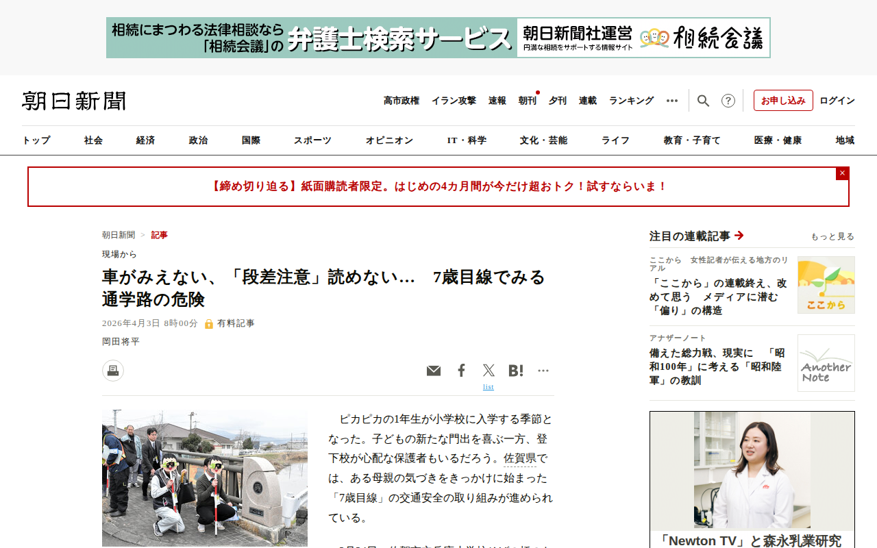 このページは、佐賀県で実施されている「7歳目線」の通学路安全点検の取り組みについて報じている。7歳は一人歩きが増え事故が多い「魔の7歳」とされており、県職員が子どもの身長に合わせてしゃがんで視界を確認する活動を行っている...