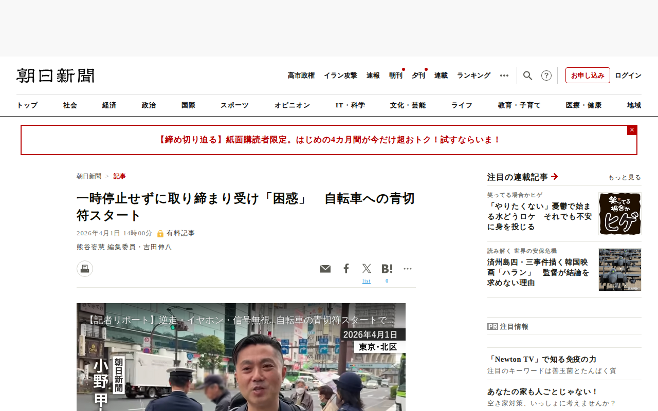 このページは、2026年4月1日から東京都で始まった自転車の交通違反に対する青切符制度について報じています。初日の取り締まりの様子を紹介しており、JR王子駅前での現場では警視庁の約25人が危険運転を監視しました。一時不停...