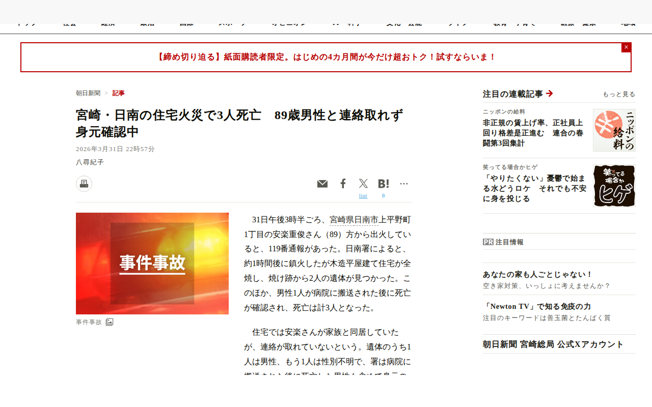 このページは、2026年3月31日に宮崎県日南市で発生した住宅火災についての記事である。午後3時半ごろ、89歳の安楽重俊さん宅から火災が発生し、約1時間後に鎮火した。木造平屋建て住宅が全焼し、焼け跡から2人の遺体が発見さ...
