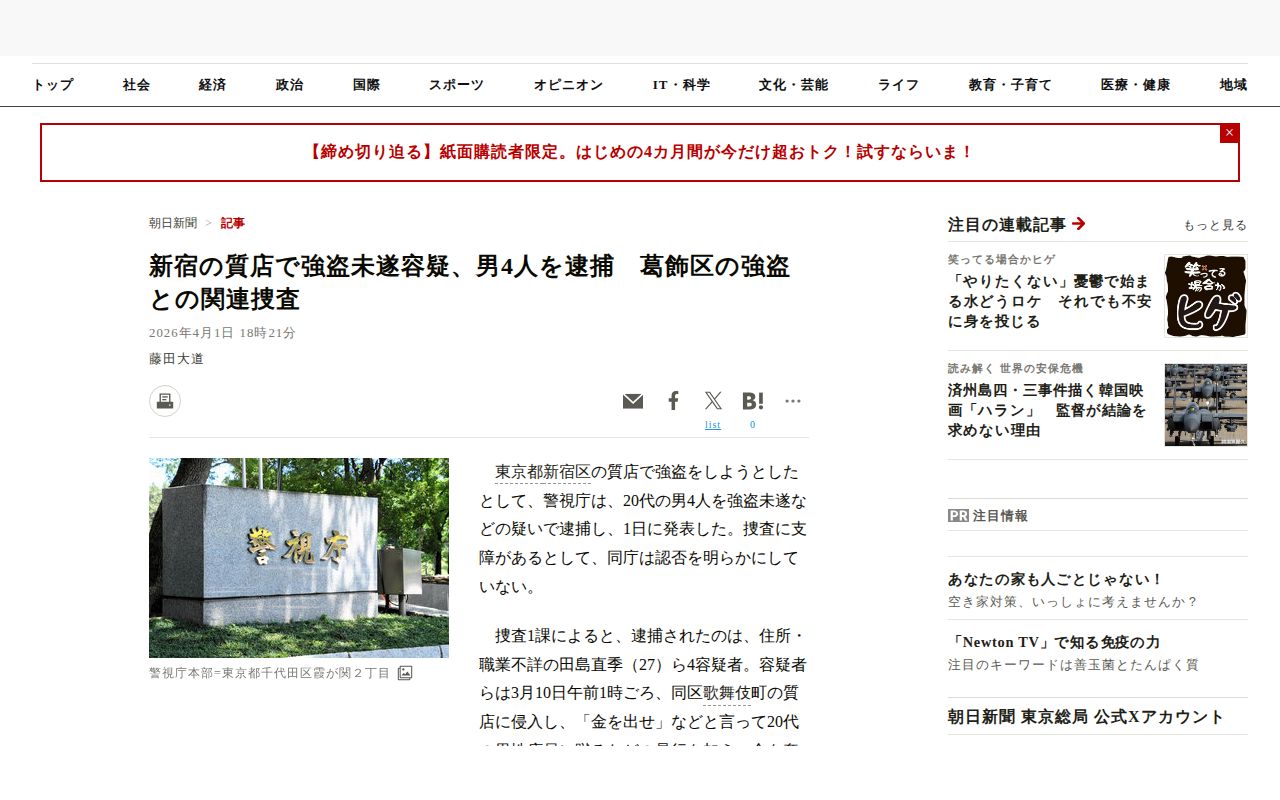 このページは、東京都新宿区の質店で強盗未遂事件を起こしたとして、警視庁が20代の男4人を逮捕したニュースを報じています。容疑者らは3月10日午前1時ごろ、歌舞伎町の質店に侵入し、店員に暴行を加えて金銭を奪おうとしましたが...