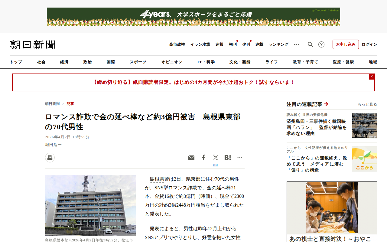 このページは、島根県東部の70代男性がSNS型ロマンス詐欺で約3億2448万円相当をだまし取られた事件を報じている。男性は昨年12月からSNSで女性と偽る人物とやり取りし、海外資産運用会社の投資を勧められた。金の延べ棒2...