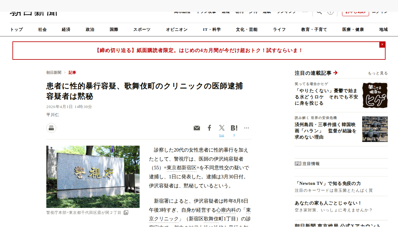 このページは、東京都新宿区歌舞伎町の心療内科クリニックの医師が、診察した20代女性患者に性的暴行を加えたとして逮捕された事件を報じている。医師・伊沢純容疑者(55)は昨年8月、初診で来院した女性患者に睡眠薬を処方した後、...