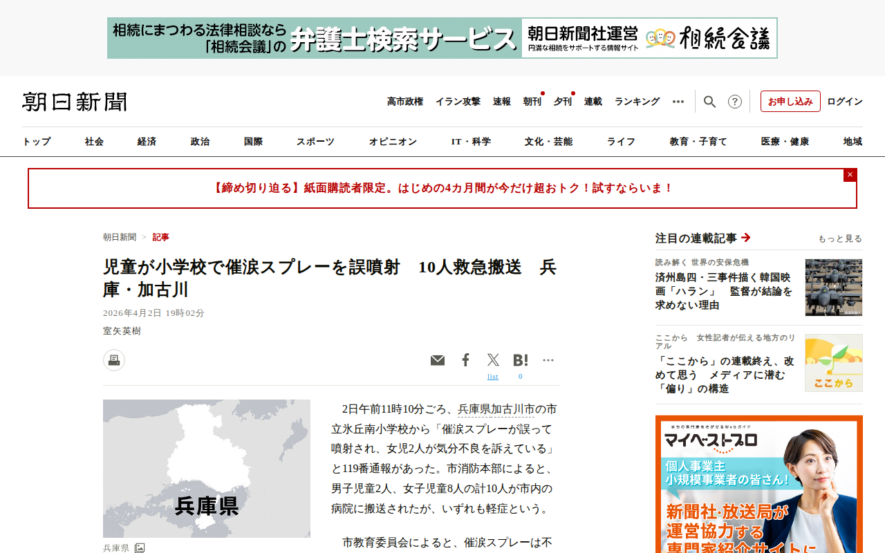 このページは、兵庫県加古川市の小学校で児童が催涙スプレーを誤噴射した事故を報じている。2日午前、不審者対策用として児童クラブ教室の冷蔵庫に保管されていた携帯型催涙スプレーを、児童が誤って持ち出し廊下に噴射。風で教室内に流...