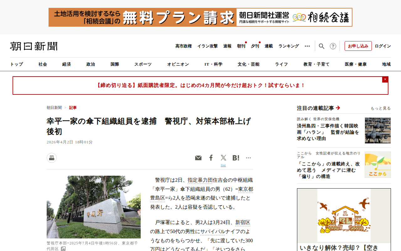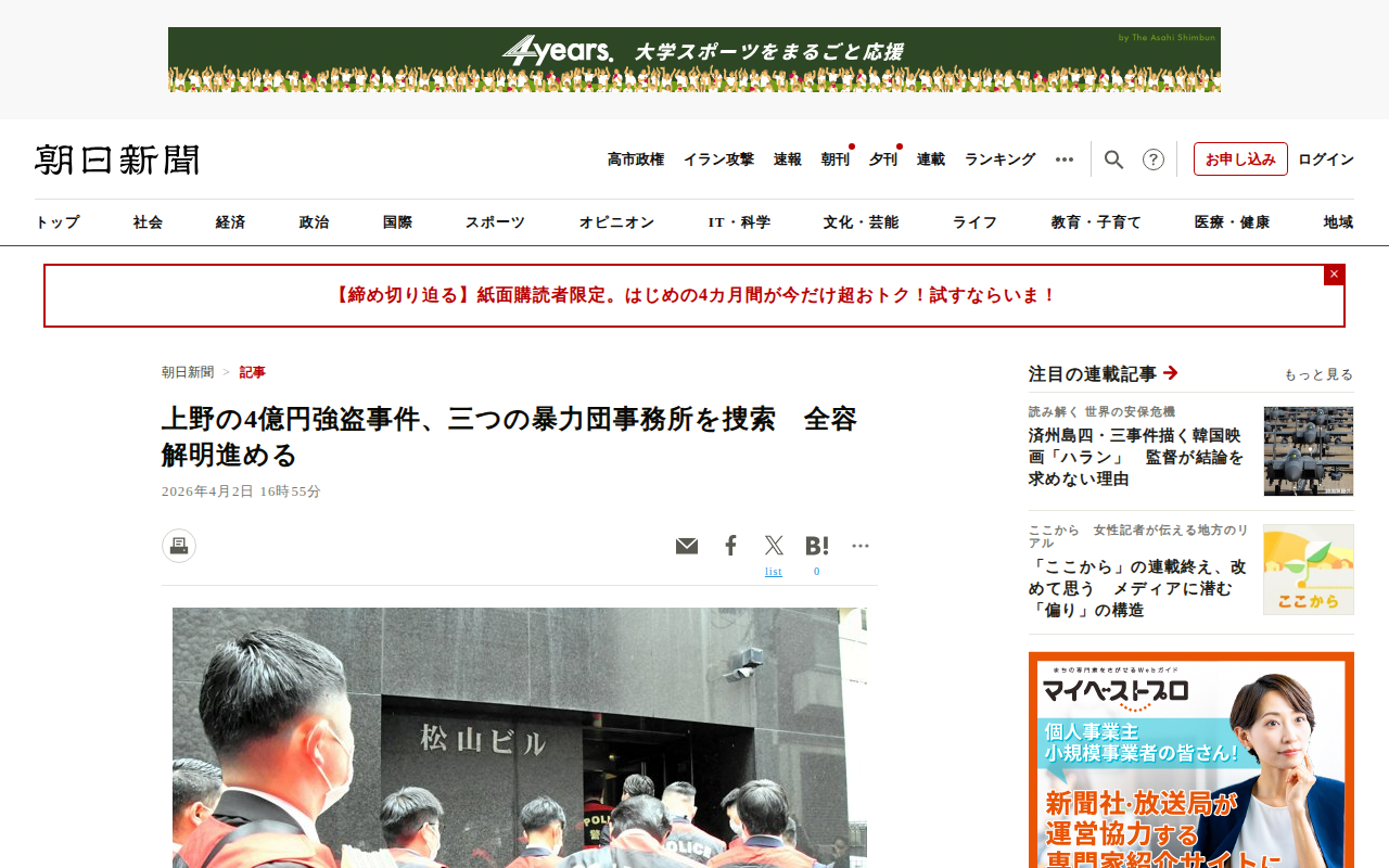 このページは、東京・上野で1月末に現金4億2300万円が奪われた強盗事件について報じている。警視庁は4月2日、指定暴力団の住吉会と極東会の両本部事務所、山口組弘道会傘下組織の事務所を家宅捜索した。3月14日に逮捕された暴...