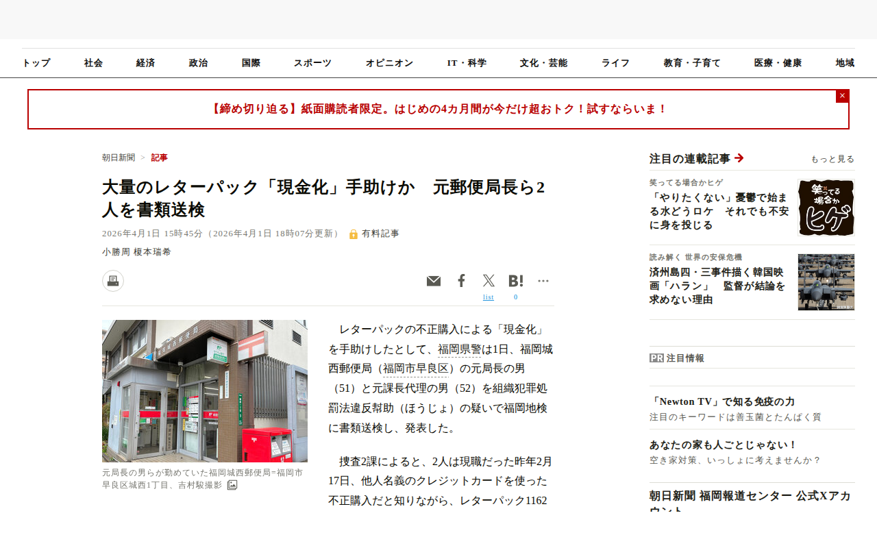 このページは、福岡城西郵便局の元局長と元課長代理の2人が、他人名義のクレジットカードで不正購入されたレターパック1162枚(約50万円)の現金化を手助けしたとして、組織犯罪処罰法違反幇助の疑いで書類送検されたニュースを報...