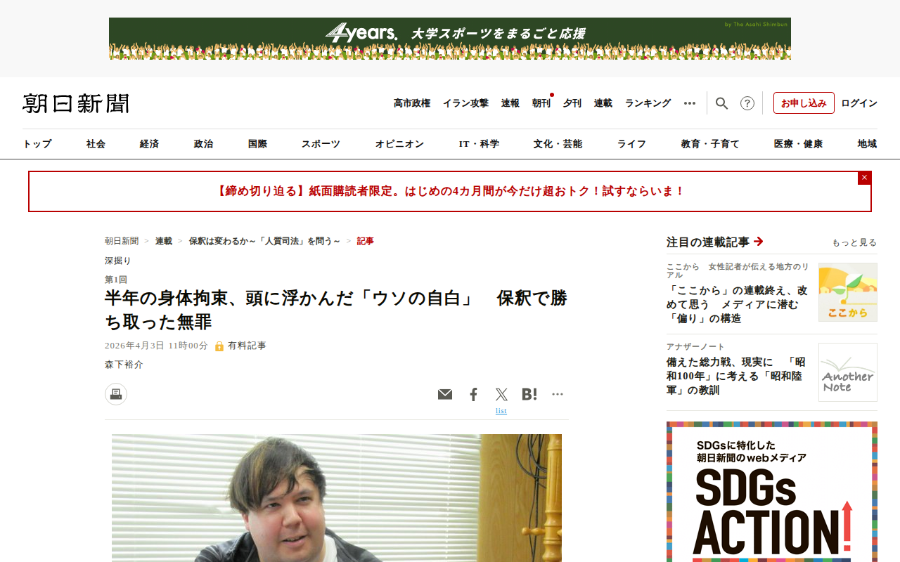 このページは、日本の司法制度における「人質司法」を批判する朝日新聞の連載記事です。米国人英語教師マーカス・カバゾスさんが、知人から受け取った荷物に覚醒剤が入っていたとして逮捕されながらも、容疑を否認し続けた結果、約6ヶ月...