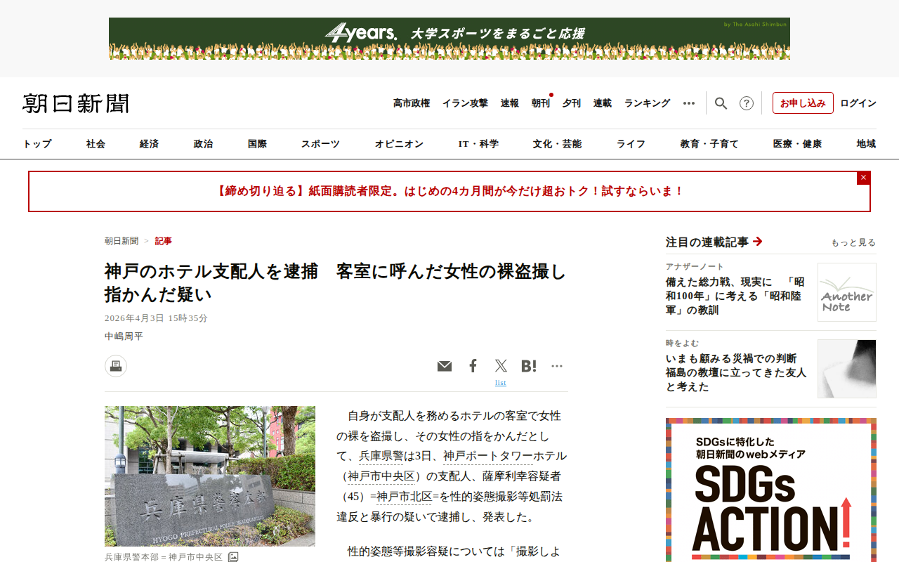 このページは、神戸ポートタワーホテルの支配人が逮捕された事件を報じている。容疑者は自身が務めるホテルの客室で、風俗店から呼んだ26歳の女性の裸をモバイルバッテリー型の小型カメラで盗撮しようとした疑いで逮捕された。また、カ...