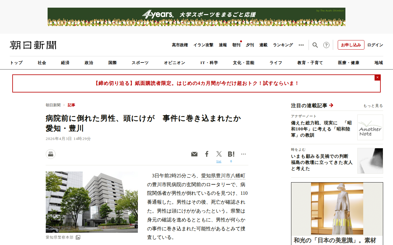 このページは、愛知県豊川市の豊川市民病院玄関前で、2026年4月3日午前2時25分頃に男性が倒れているのが発見され、その後死亡が確認されたことを報じています。男性は頭にけががあり、県警は何らかの事件に巻き込まれた可能性が...