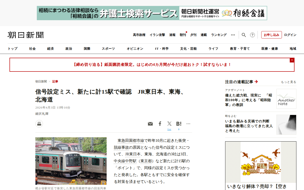 このページは、東急田園都市線の2025年10月の衝突・脱線事故の原因となった信号設定ミスについて報じています。JR東日本、東海、北海道の3社が新たに計15駅でも同様のミスを発見したと発表。JR東が13駅、東海と北海道が各...