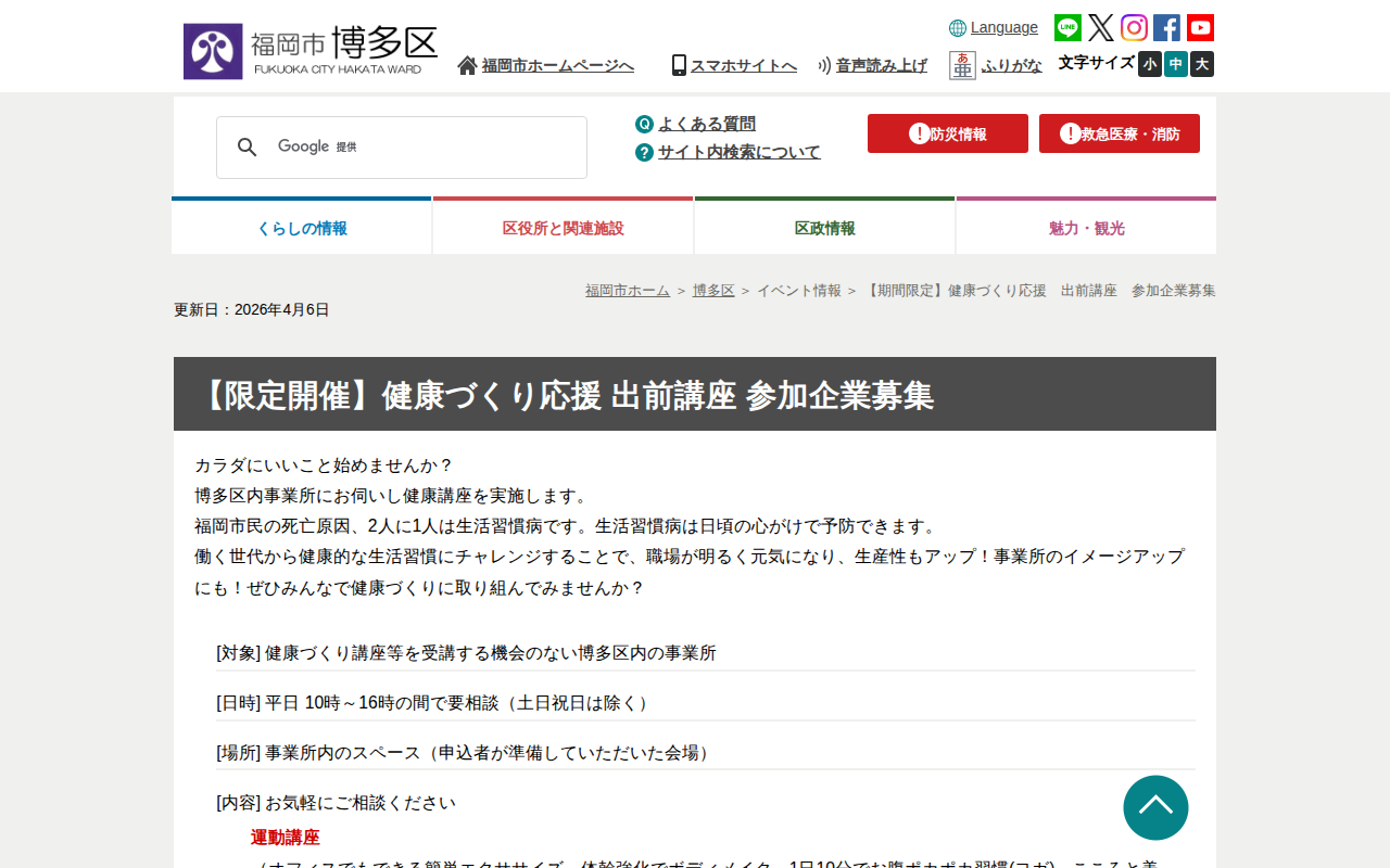 福岡市 【期間限定】健康づくり応援 出前講座 参加企業募集