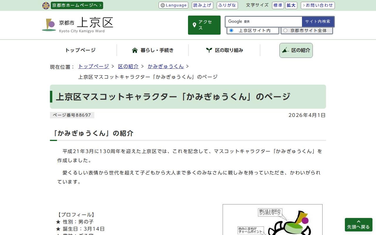 京都市上京区役所:上京区マスコットキャラクター「かみぎゅうくん」のページ