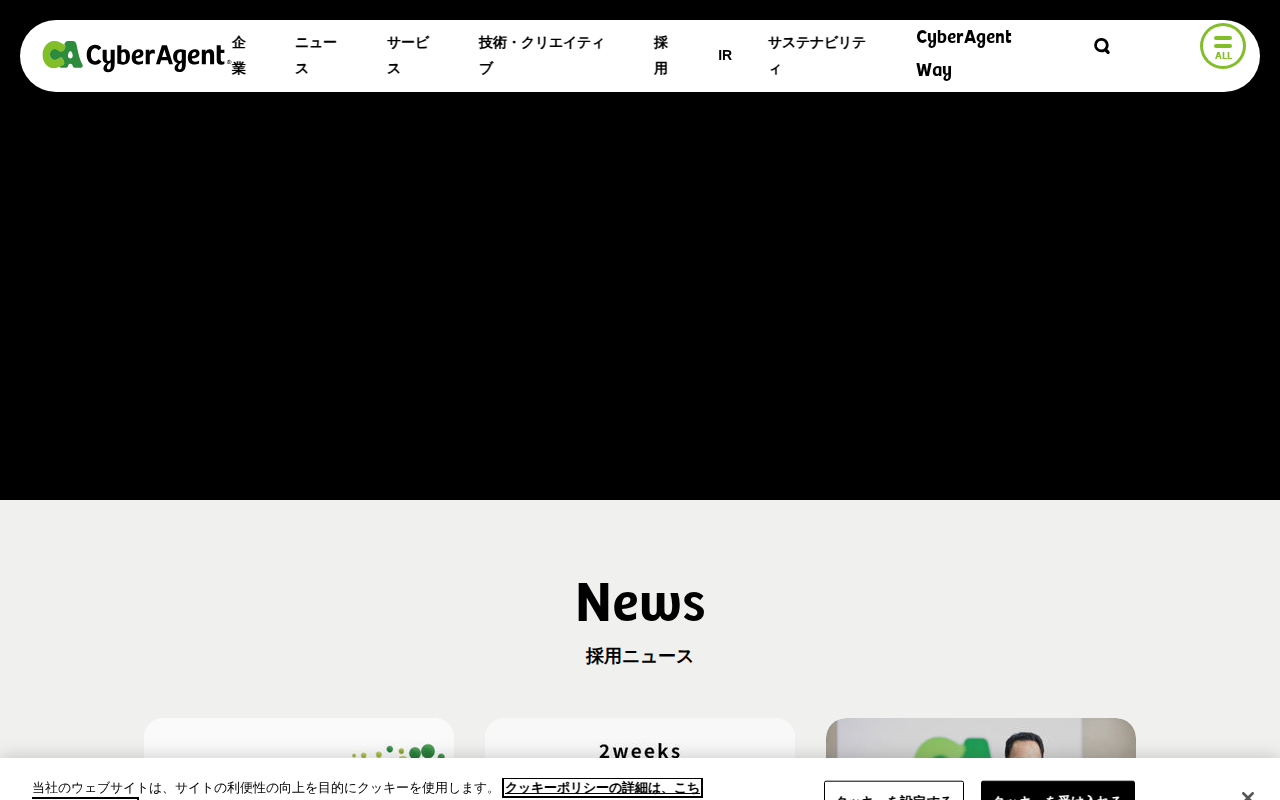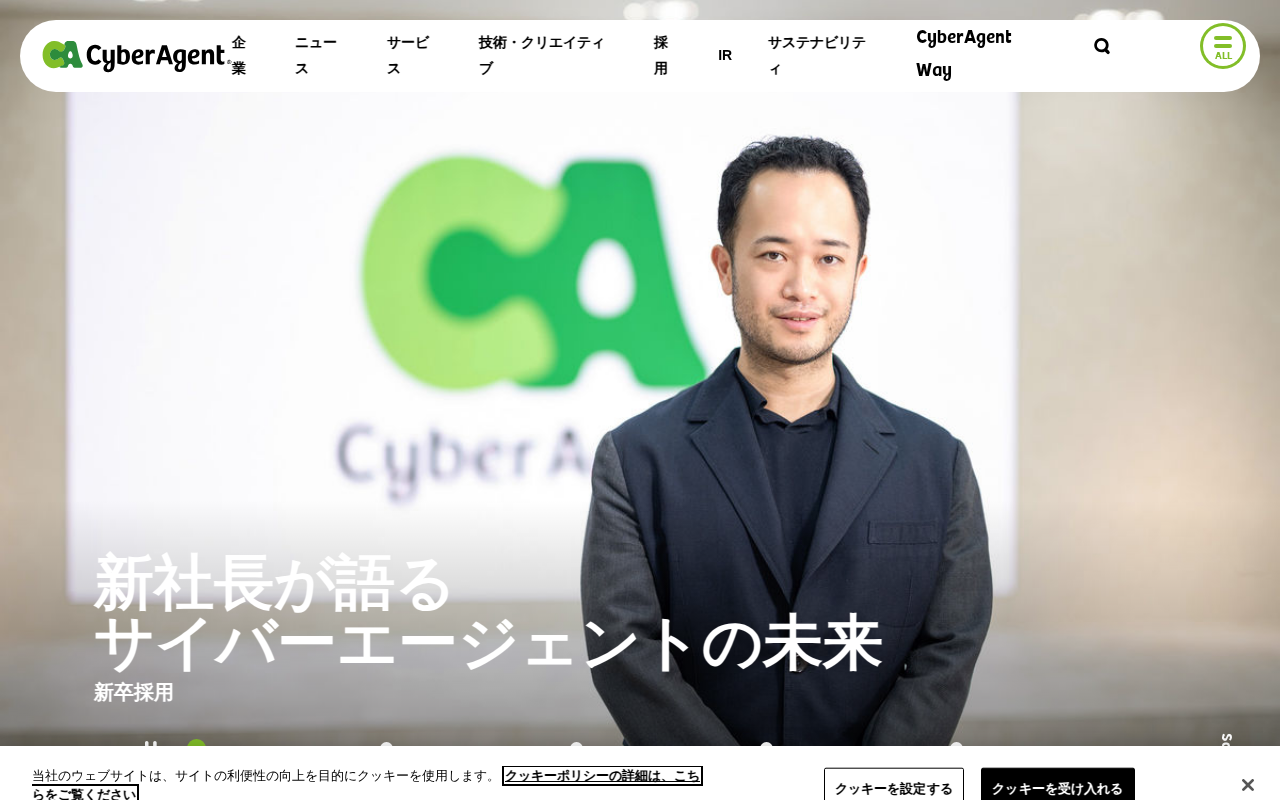 このページはサイバーエージェントの公式ウェブサイトです。企業情報、ニュース、サービス、採用情報、投資家向け情報、サステナビリティなどのメニューが提供されています。新社長による未来ビジョンの発信や新卒採用情報が掲載されてお...