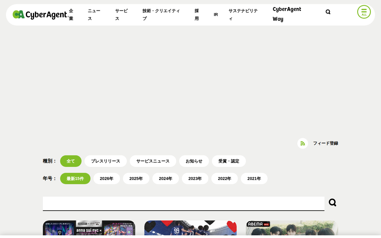 このページは株式会社サイバーエージェントのニュースページです。プレスリリース、サービスニュース、お知らせ、受賞・認定などを年号・種別で絞り込めます。最新ニュースとしては、アバターSNS「ピグパーティ」のコラボ企画、ABE...