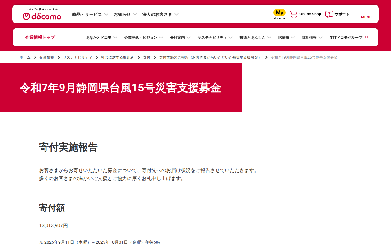 令和7年9月静岡県台風15号災害支援募金 | 企業情報 | NTTドコモ