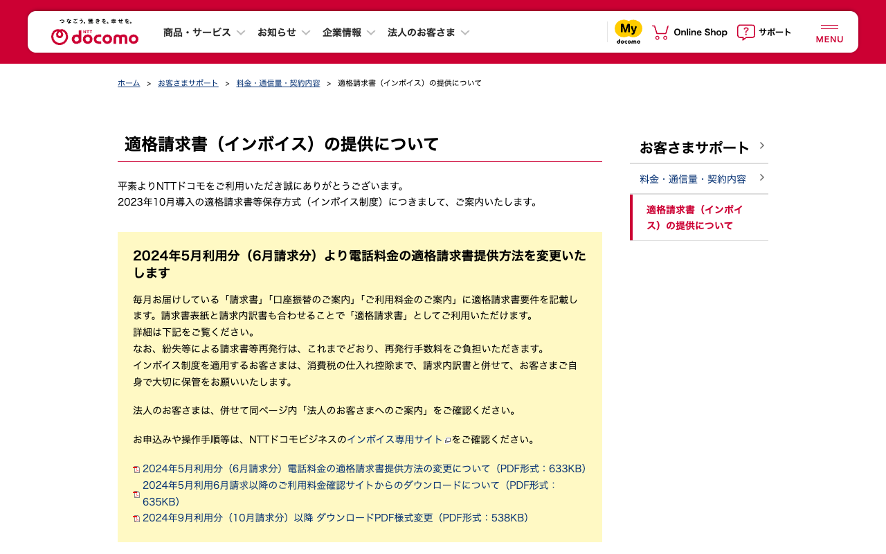 適格請求書(インボイス)の提供について | お客さまサポート | NTTドコモ