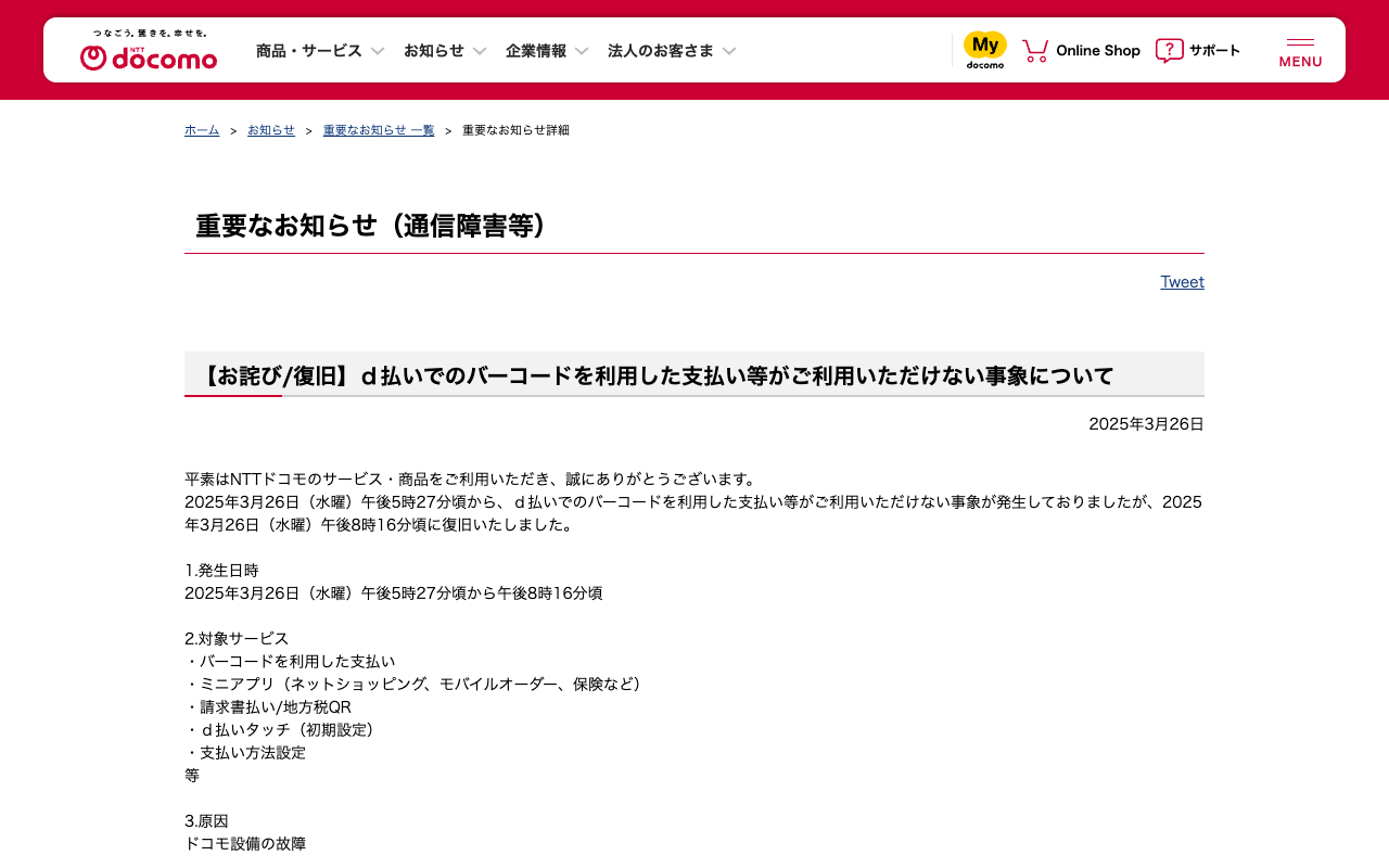 重要なお知らせ(通信障害等) : 【お詫び/復旧】d払いでのバーコードを利用した支払い等がご利用いただけない事象について | お知らせ | NTTドコモ
