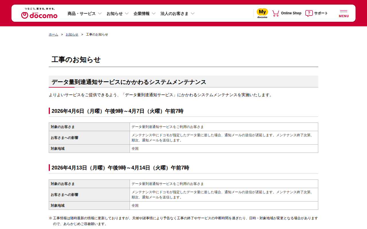工事のお知らせ : データ量到達通知サービスにかかわるシステムメンテナンス | お知らせ | NTTドコモ