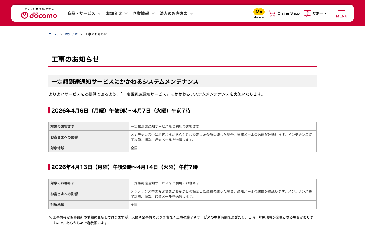 工事のお知らせ : 一定額到達通知サービスにかかわるシステムメンテナンス | お知らせ | NTTドコモ