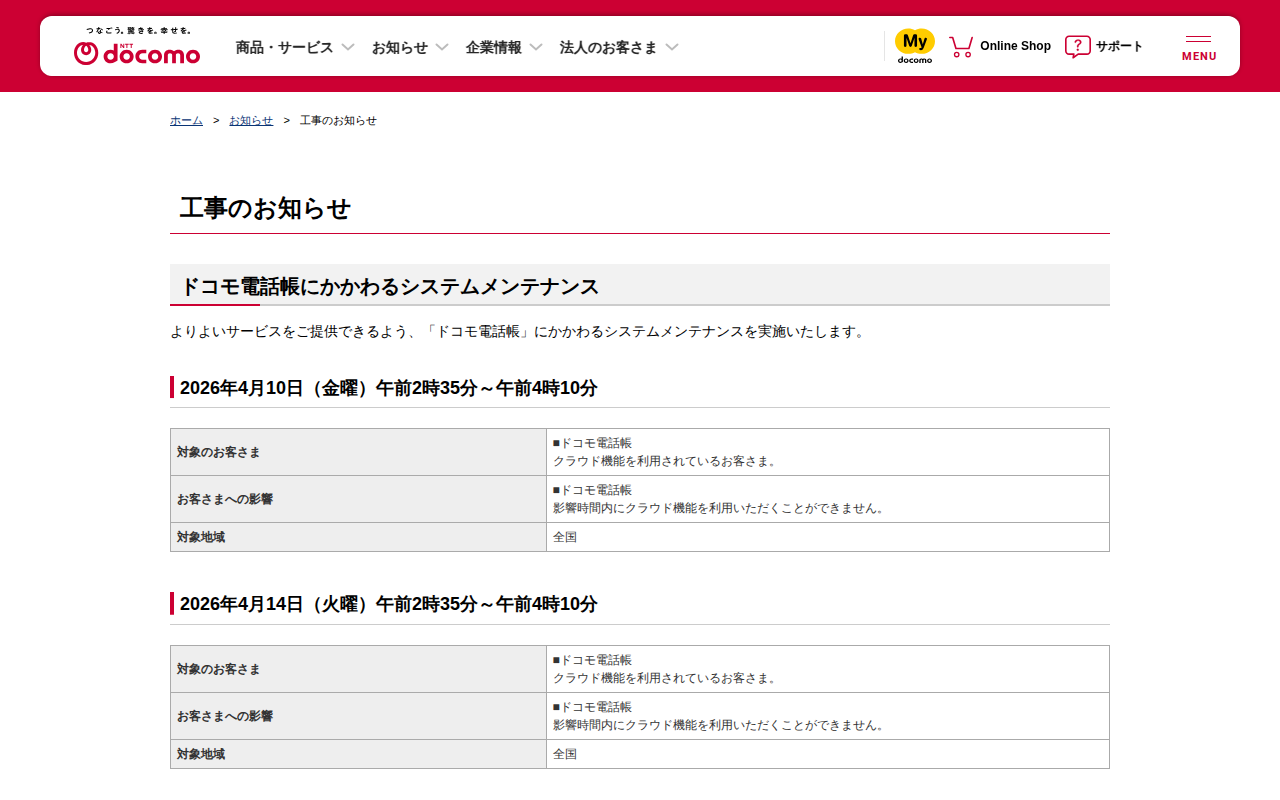 工事のお知らせ : ドコモ電話帳にかかわるシステムメンテナンス | お知らせ | NTTドコモ