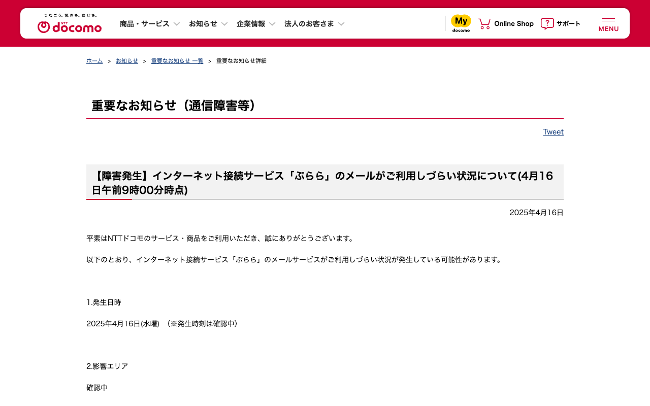 重要なお知らせ(通信障害等) : 【障害発生】インターネット接続サービス「ぷらら」のメールがご利用しづらい状況について(4月16日午前9時00分時点) | お知らせ | NTTドコモ