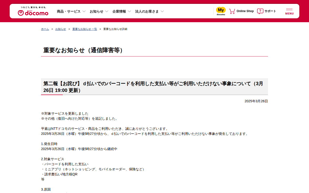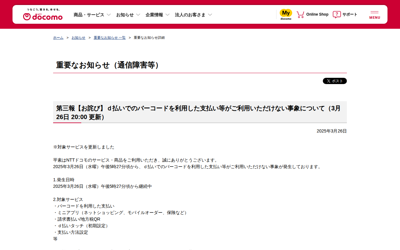 重要なお知らせ(通信障害等) : 第三報【お詫び】d払いでのバーコードを利用した支払い等がご利用いただけない事象について(3月26日 20:00 更新) | お知らせ | NTTドコモ