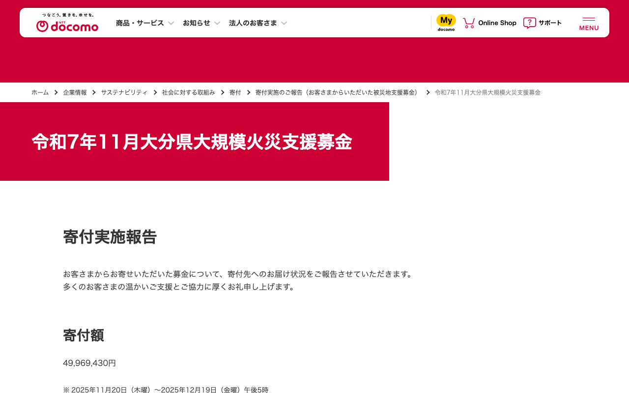 令和7年11月大分県大規模火災支援募金 | 企業情報 | NTTドコモ