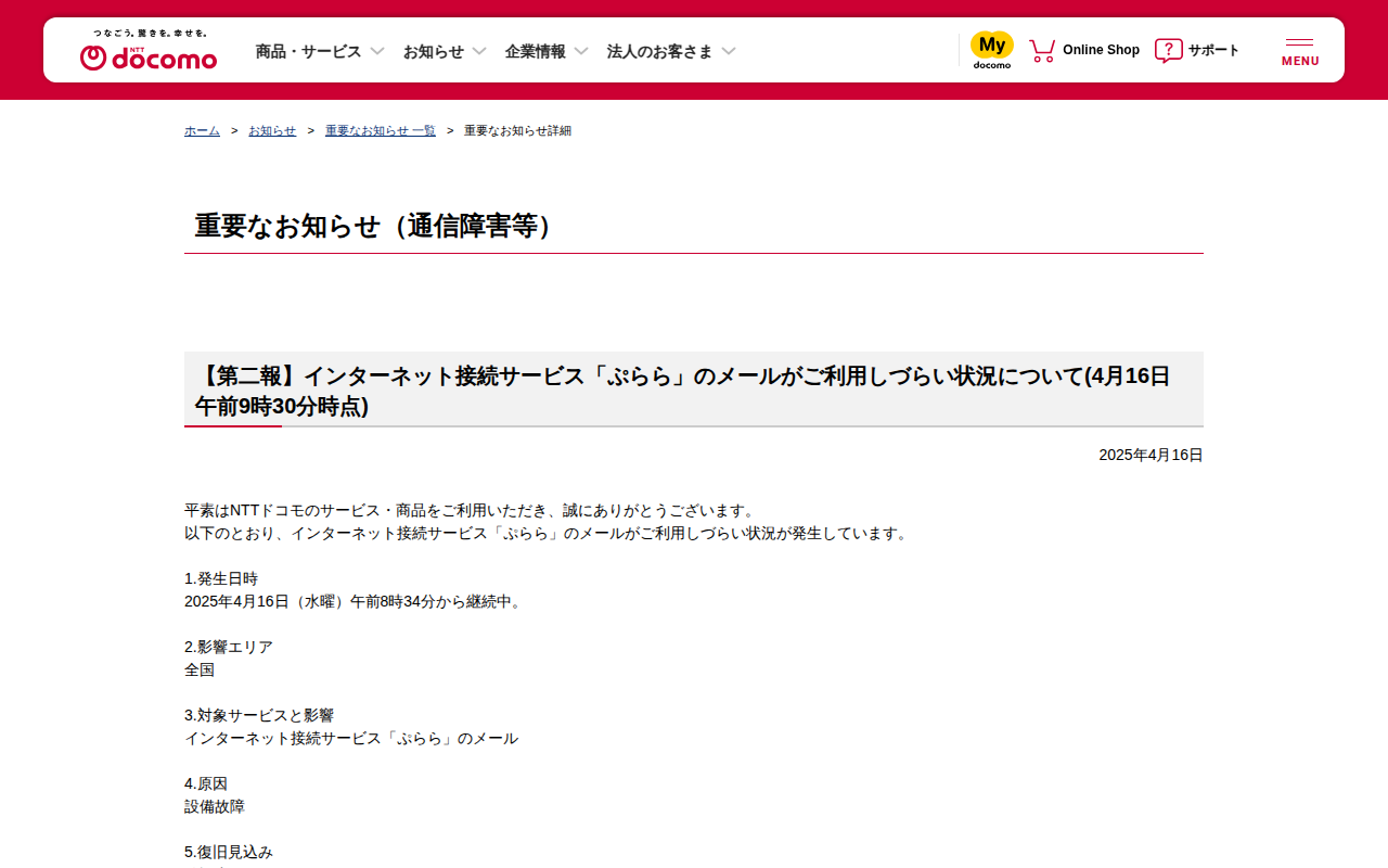 重要なお知らせ(通信障害等) : 【第二報】インターネット接続サービス「ぷらら」のメールがご利用しづらい状況について(4月16日 午前9時30分時点) | お知らせ | NTTドコモ