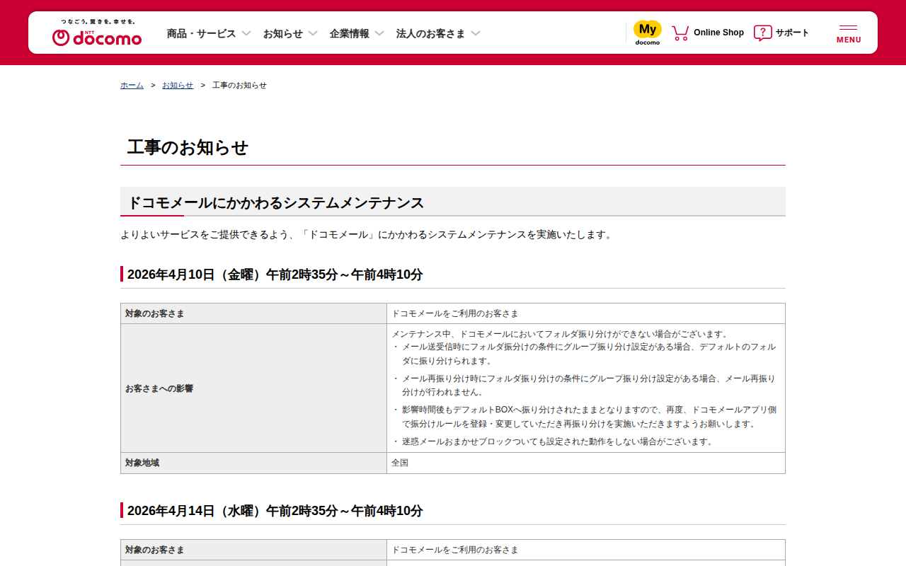 工事のお知らせ : ドコモメールにかかわるシステムメンテナンス | お知らせ | NTTドコモ