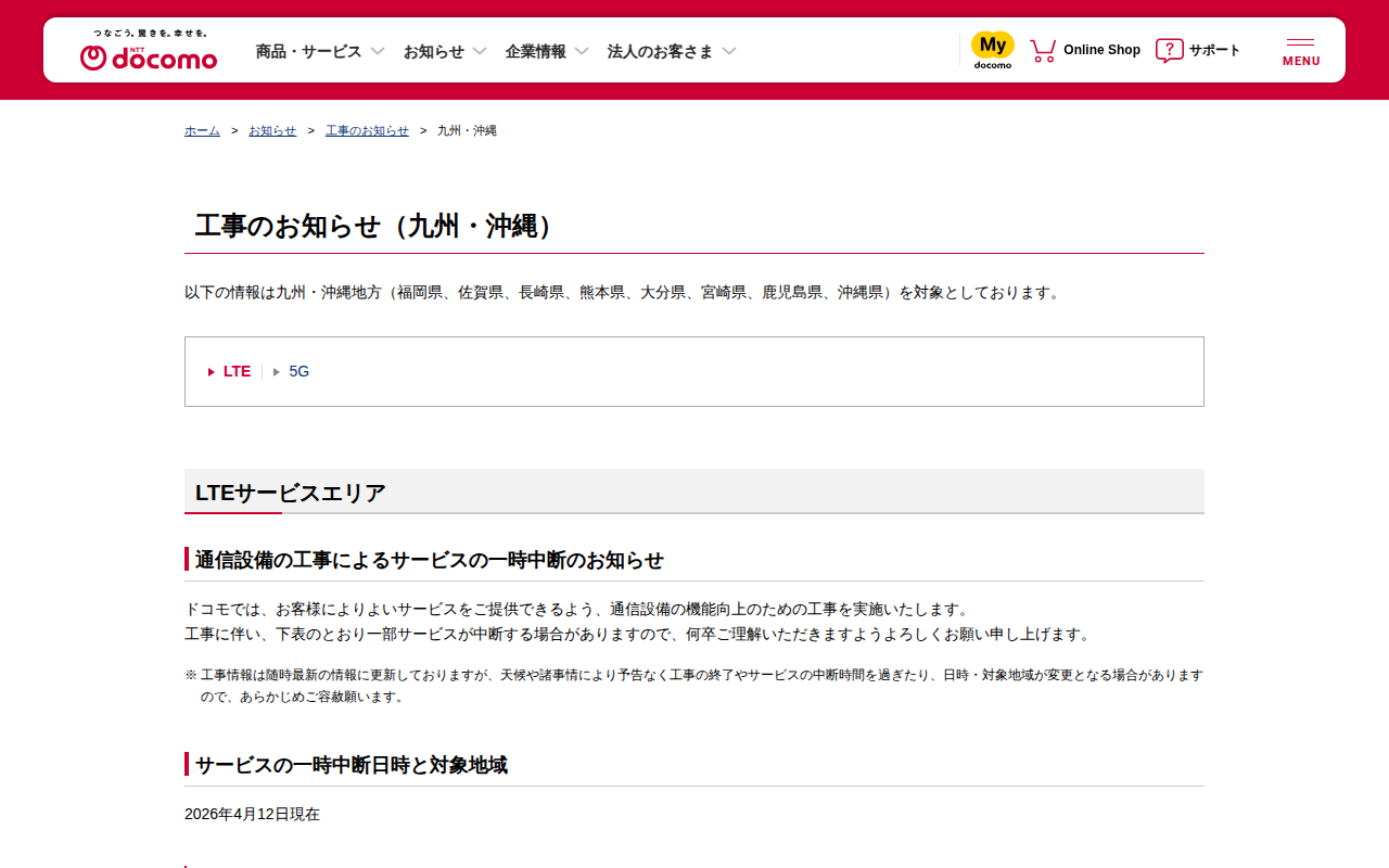 工事のお知らせ(九州・沖縄) : LTE | お知らせ | NTTドコモ