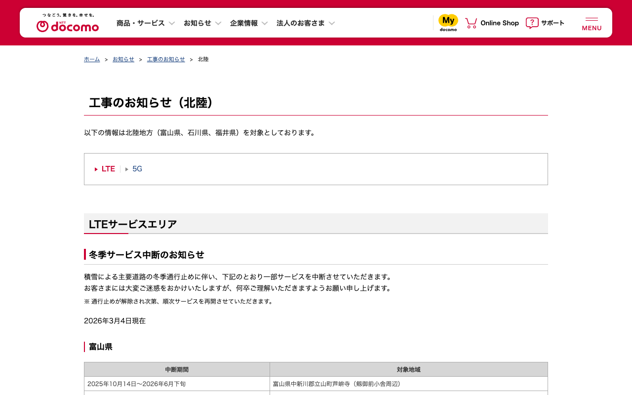 工事のお知らせ(北陸) : LTE | お知らせ | NTTドコモ