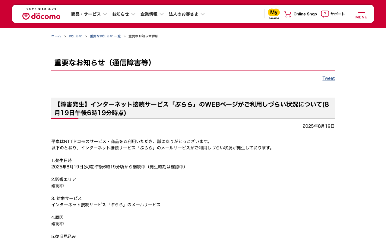 重要なお知らせ(通信障害等) : 【障害発生】インターネット接続サービス「ぷらら」のWEBページがご利用しづらい状況について(8月19日午後6時19分時点) | お知らせ | NTTドコモ