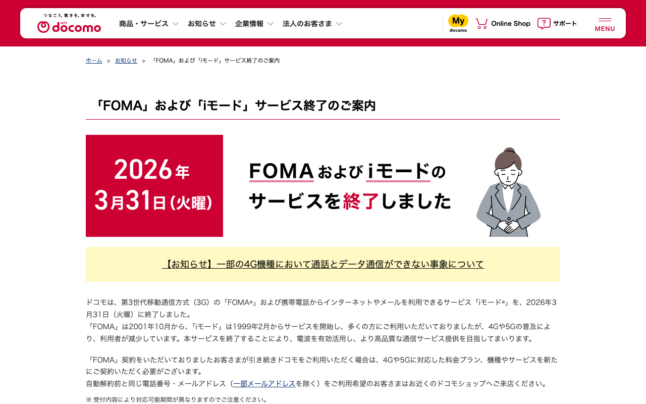 「FOMA」および「iモード」サービス終了のご案内 | お知らせ | NTTドコモ