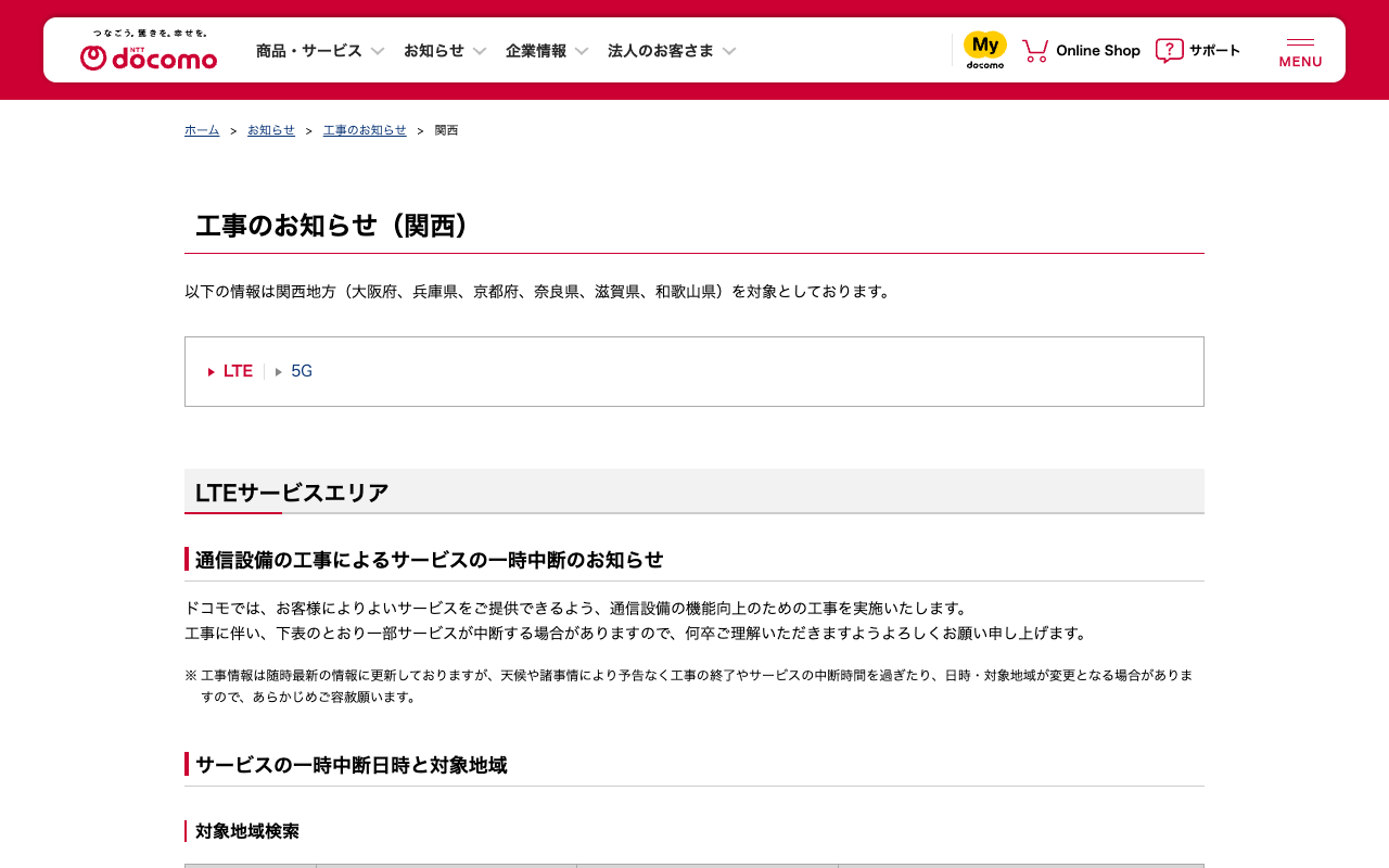 工事のお知らせ(関西) : LTE | お知らせ | NTTドコモ