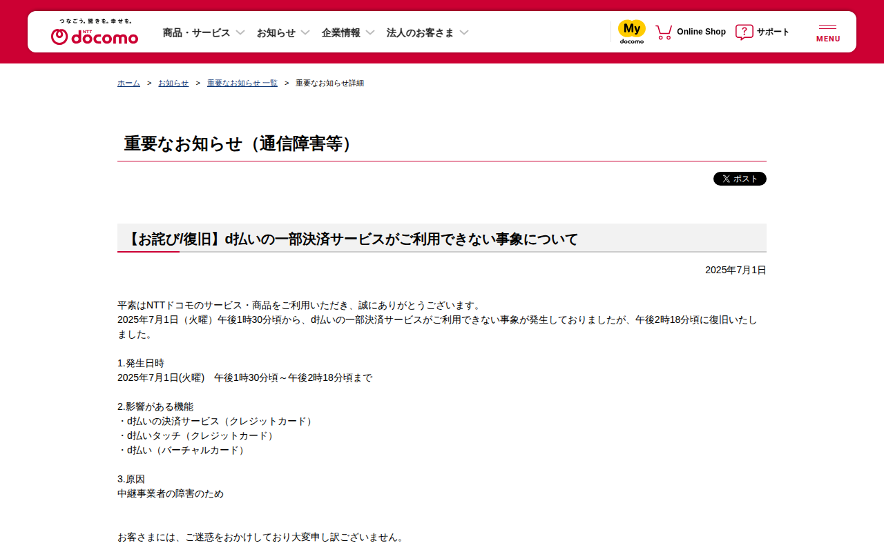 重要なお知らせ(通信障害等) : 【お詫び/復旧】d払いの一部決済サービスがご利用できない事象について | お知らせ | NTTドコモ
