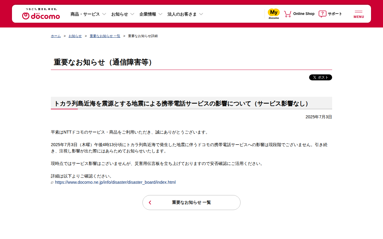 重要なお知らせ(通信障害等) : トカラ列島近海を震源とする地震による携帯電話サービスの影響について(サービス影響なし) | お知らせ | NTTドコモ