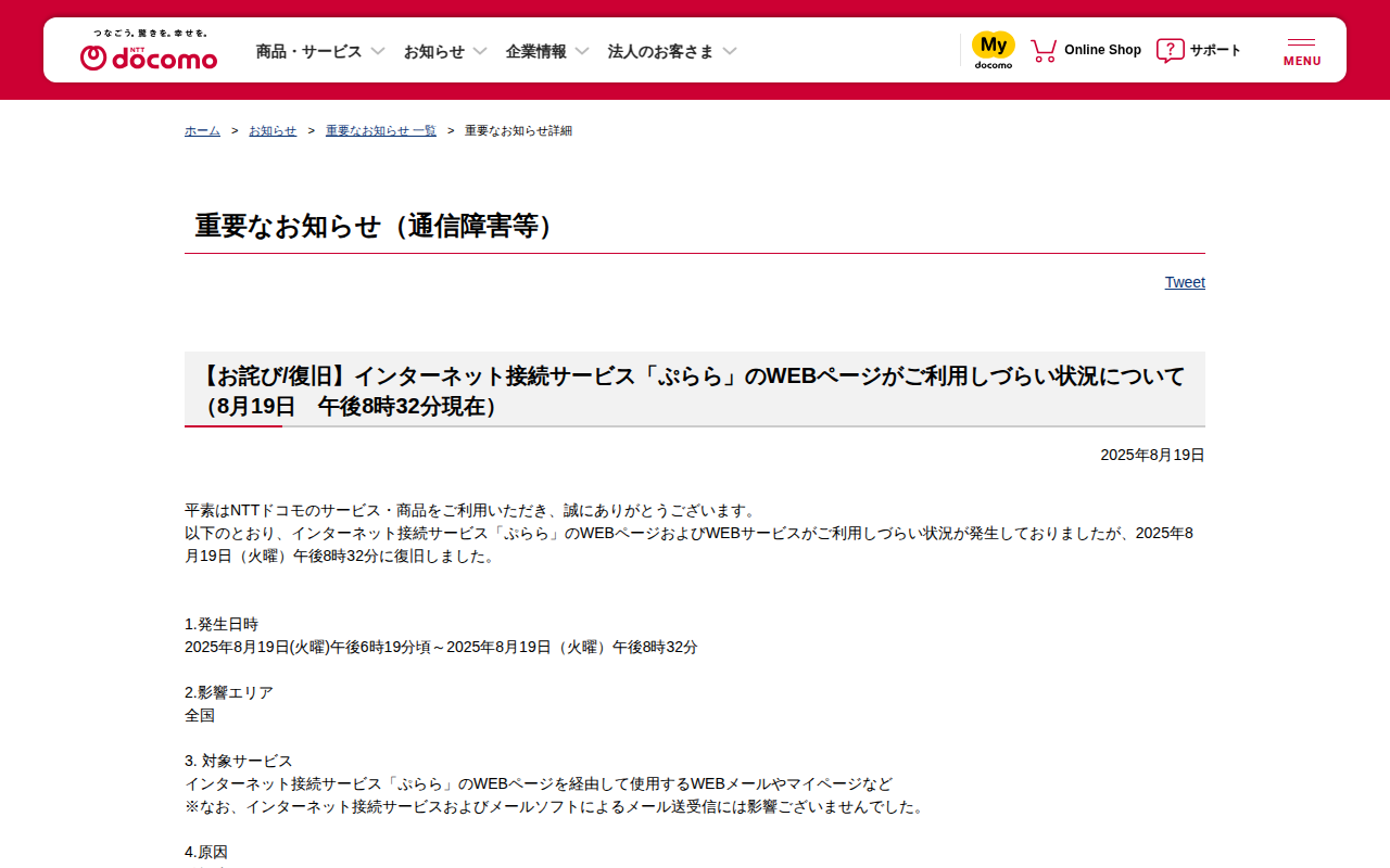 重要なお知らせ(通信障害等) : 【お詫び/復旧】インターネット接続サービス「ぷらら」のWEBページがご利用しづらい状況について(8月19日 午後8時32分現在) | お知らせ | NTTドコモ