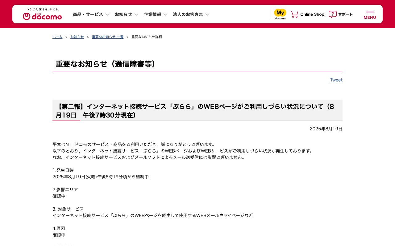 重要なお知らせ(通信障害等) : 【第二報】インターネット接続サービス「ぷらら」のWEBページがご利用しづらい状況について(8月19日 午後7時30分現在) | お知らせ | NTTドコモ