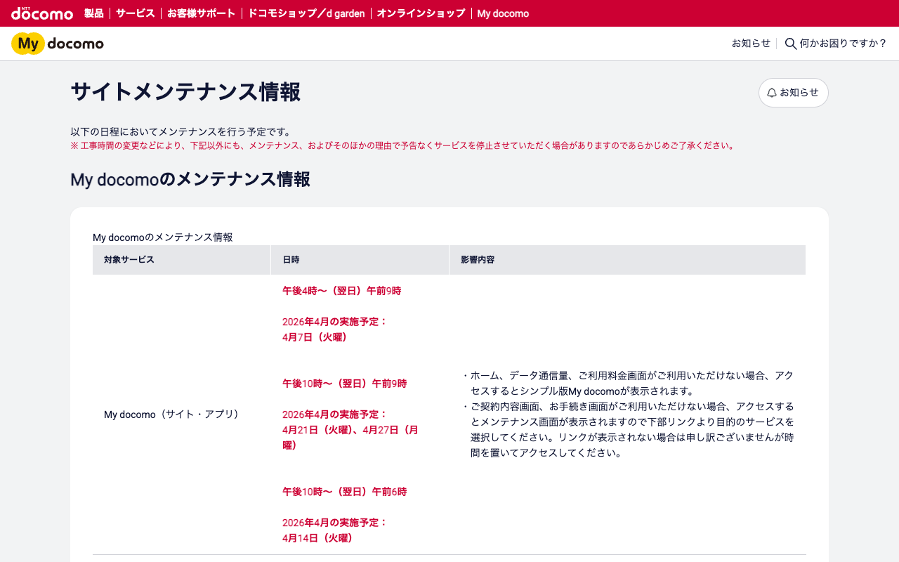 サイトメンテナンス情報 | My docomo | NTTドコモ