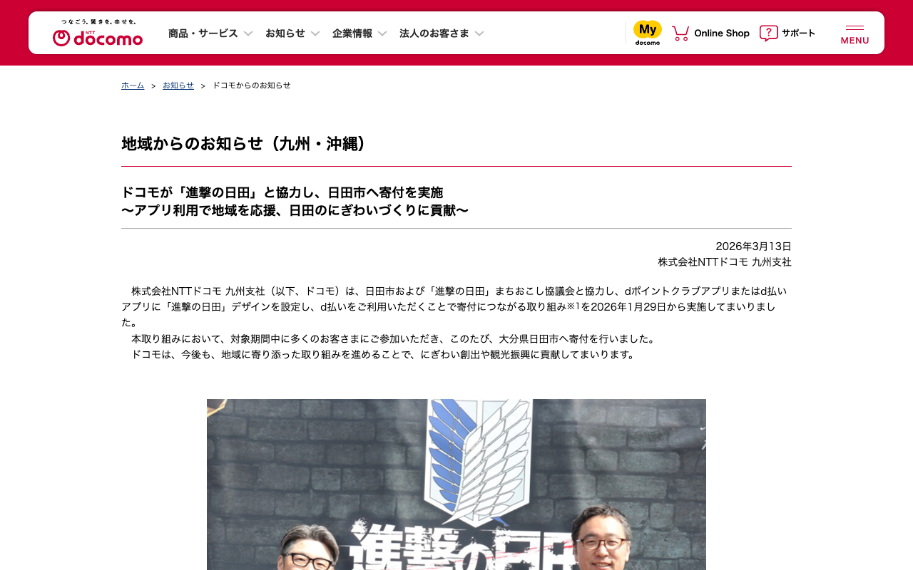 地域からのお知らせ(九州・沖縄) : ドコモが「進撃の日田」と協力し、日田市へ寄付を実施~アプリ利用で地域を応援、日田のにぎわいづくりに貢献~ | お知らせ | NTTドコモ