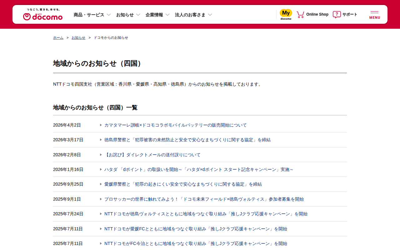 地域からのお知らせ(四国) | お知らせ | NTTドコモ