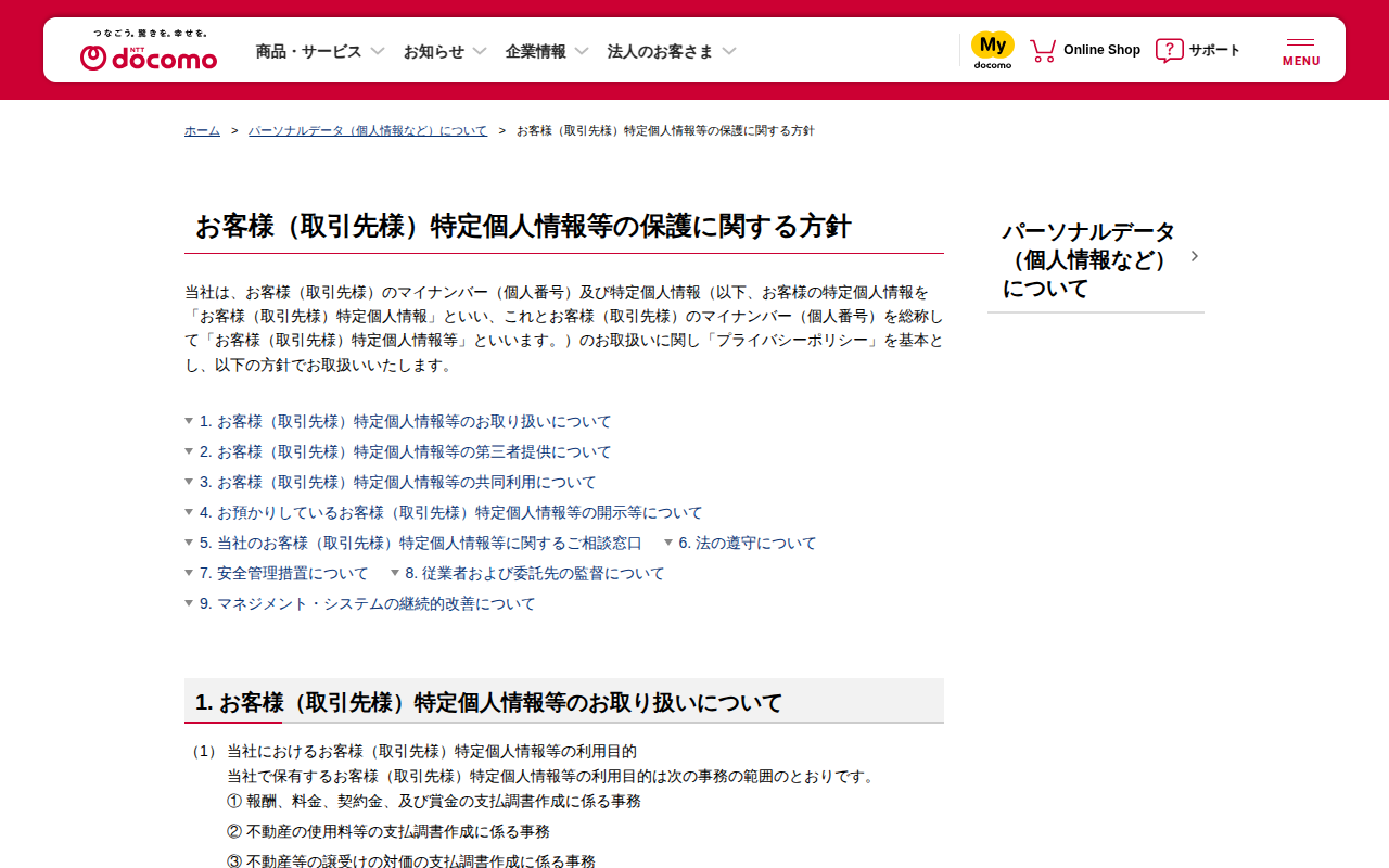 お客様(取引先様)特定個人情報等の保護に関する方針 | パーソナルデータ(個人情報など)について | NTTドコモ