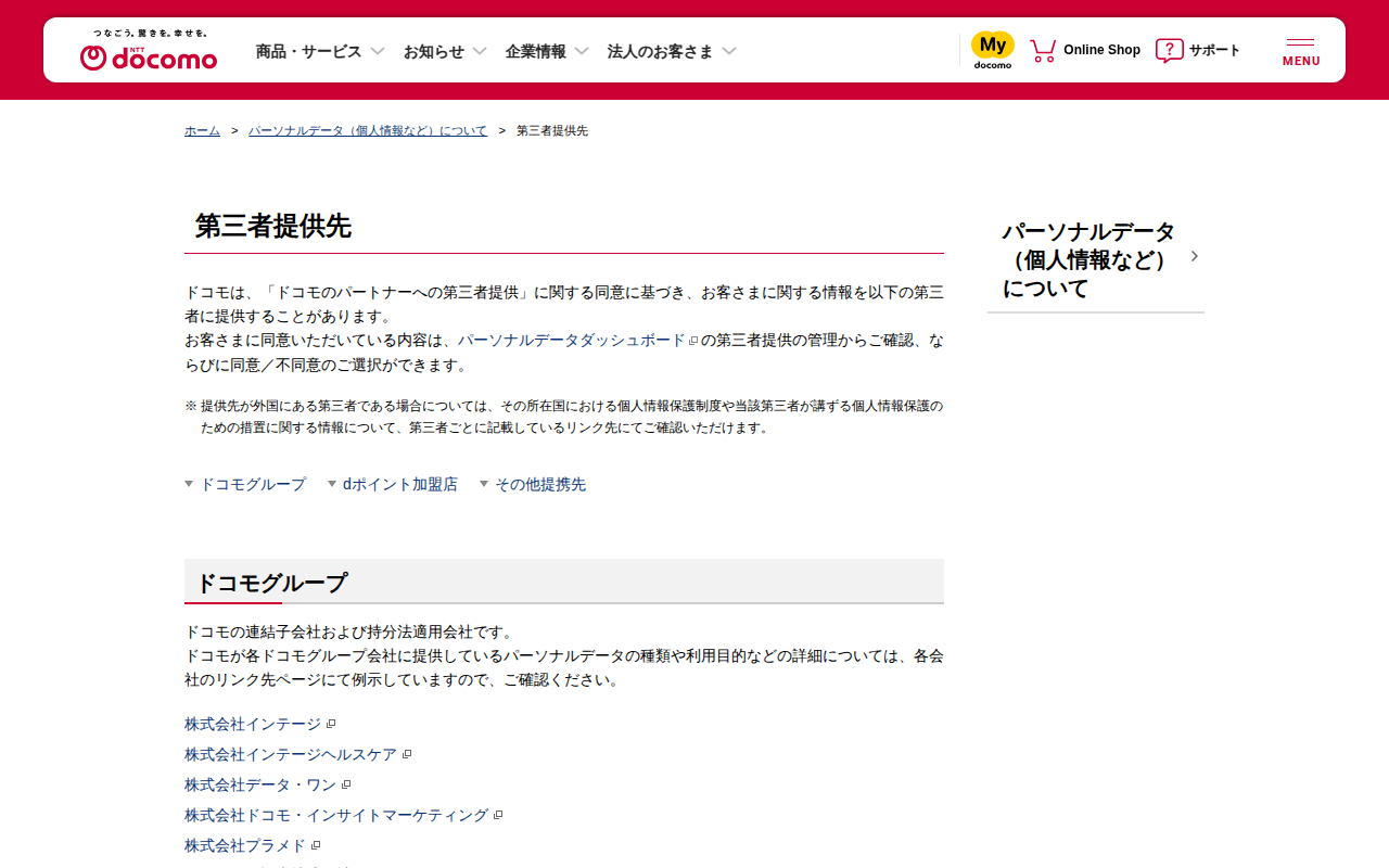 第三者提供先 | パーソナルデータ(個人情報など)について | NTTドコモ